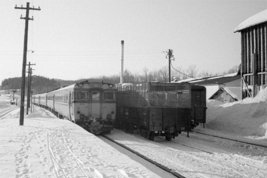 | 北海道へ行った1976年2月、記録が無く記憶も定かではないが、多分、小頓別で撮影した天北線急行であると思う。北海道特有の車両前面に番号が入っている。 天北線もすでに廃止されてしまった |