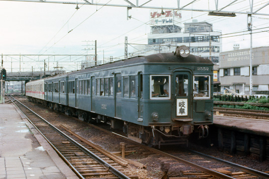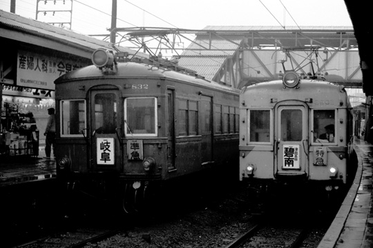 | 新岐阜駅にて、5000系と3400系。 この頃の名鉄は国鉄に対してサービスは優位であり、新岐阜からも各地へ向かう優等列車が頻繁に発着していた。現在では存続が危ぶまれるローカル線となってしまった蒲郡線は当時は三河湾沿岸を走る観光路線であり,本線から多くの特急が直通していた。1972年3月撮影。 |