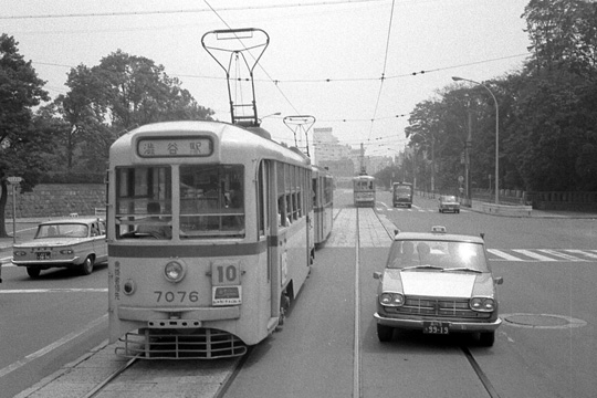 青山通を行く7500型と6000型。1968年8月撮影。7500型の左側を走っている東急バス。6、9、10系統を担当していた青山営業所は1968年9月に廃止された。
