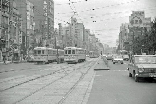 新宿からは11,12,13系統が発着していた.靖国通を大ガード方向を望む.